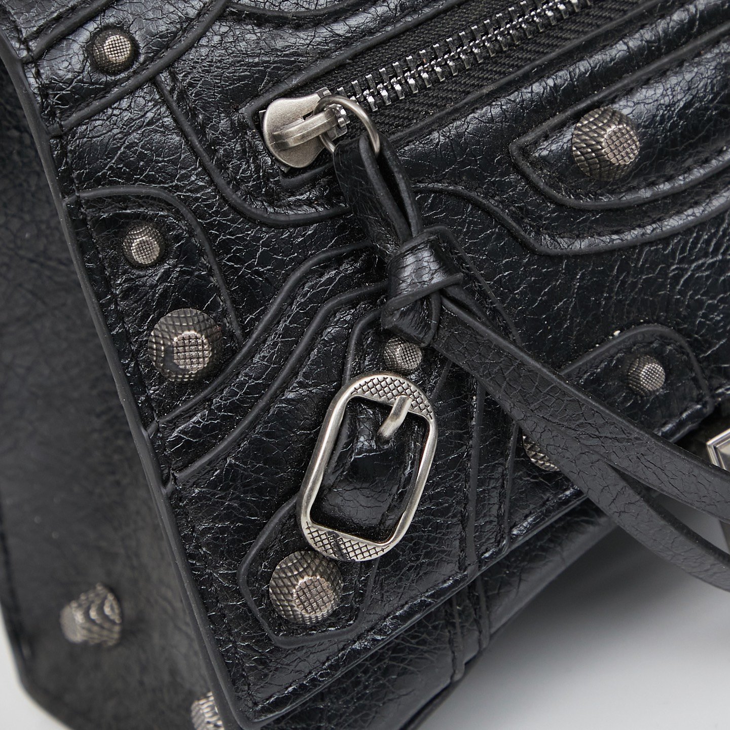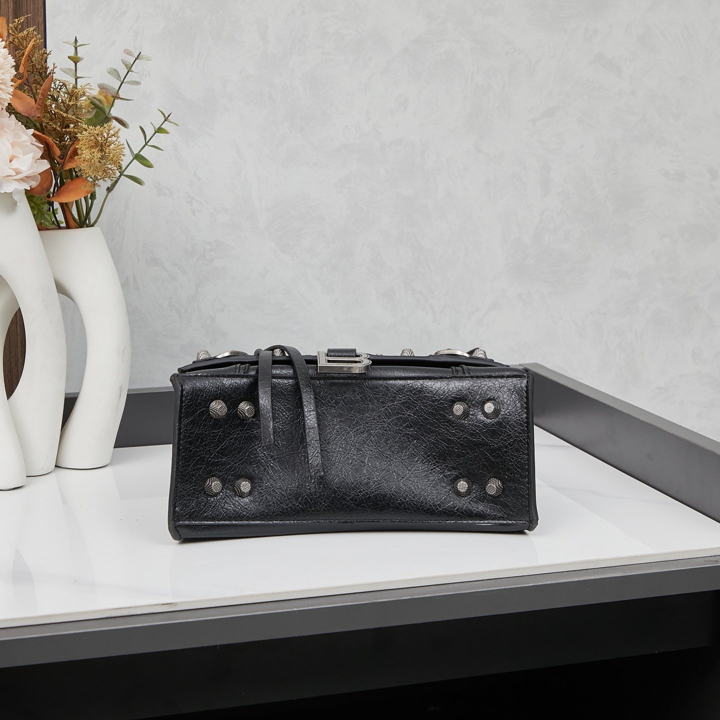 Small size, with box, motorcycle hourglass bag|||Balenciaga motorcycle hourglass bag. Have you heard of the collaboration between Balenciaga’s hourglass and motorcycle bag? Look at this combination of Hourglass bag and Le Cagole #motorcycle bag#. The hourglass bag body is covered with rose studs of the motorcycle bag. Black Arena lambskin is full of punk style. Quite interesting. Size: 23x16x10.