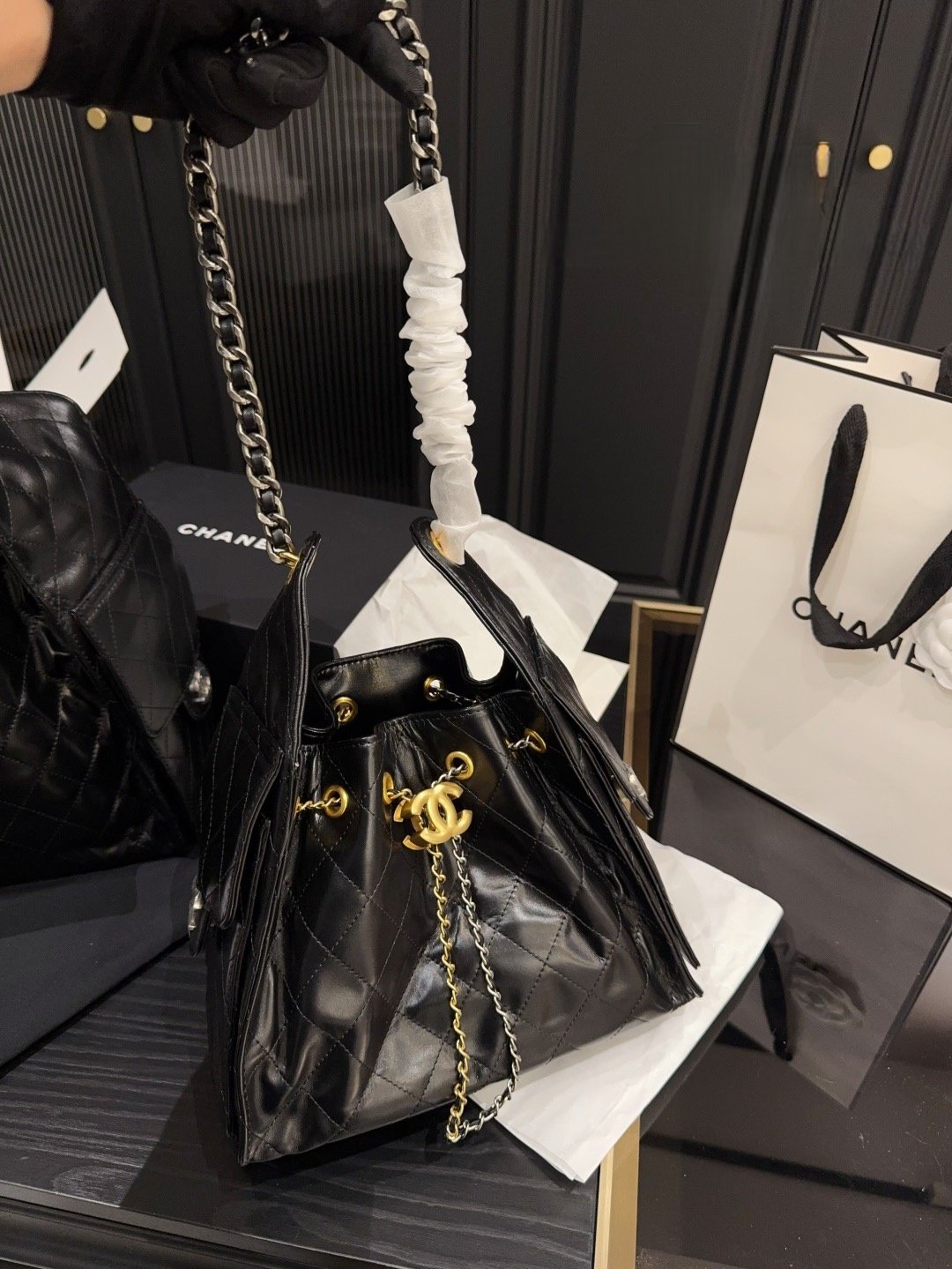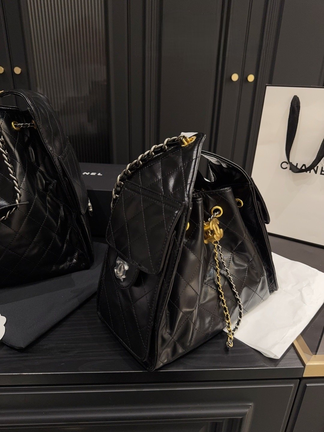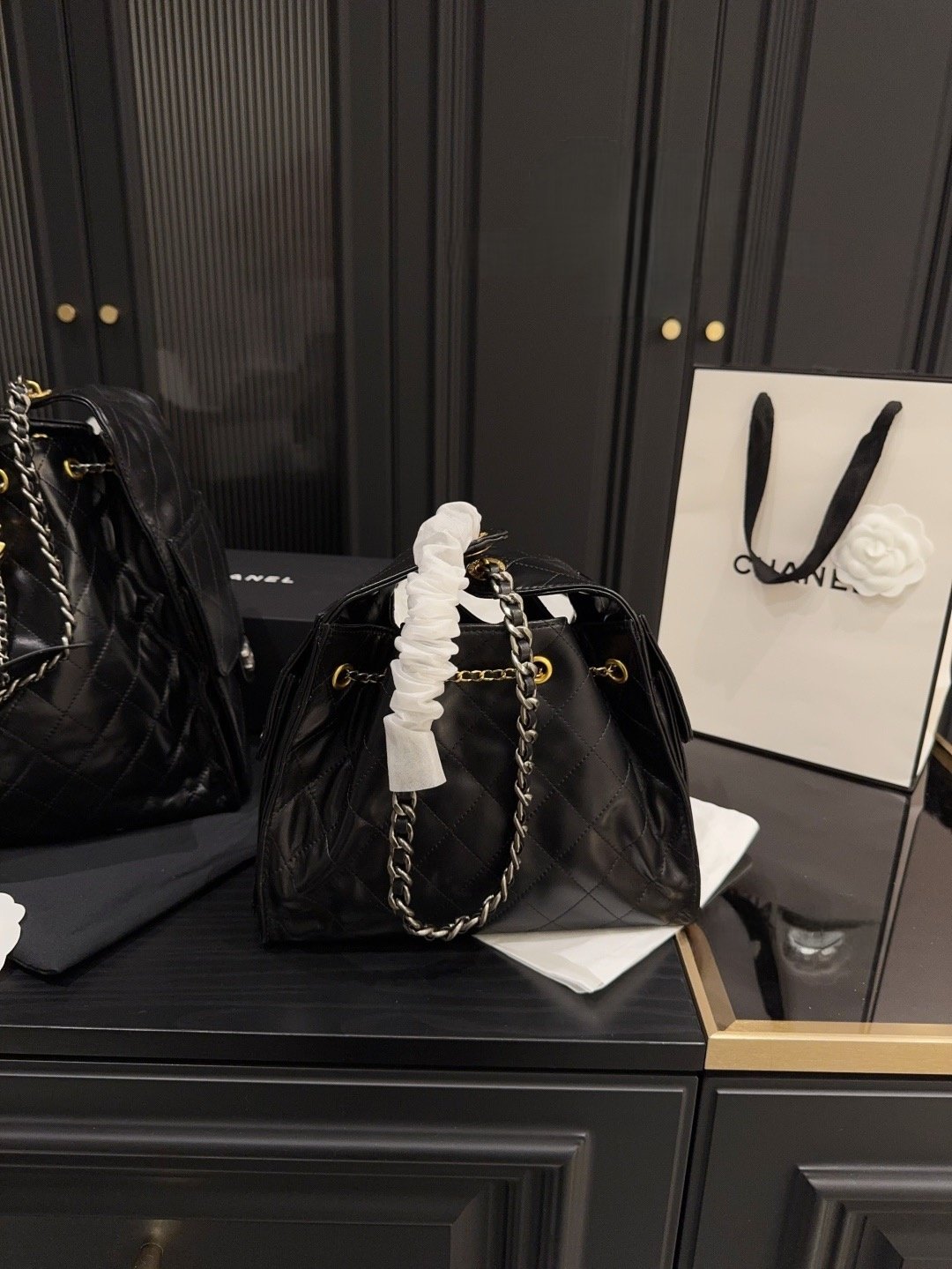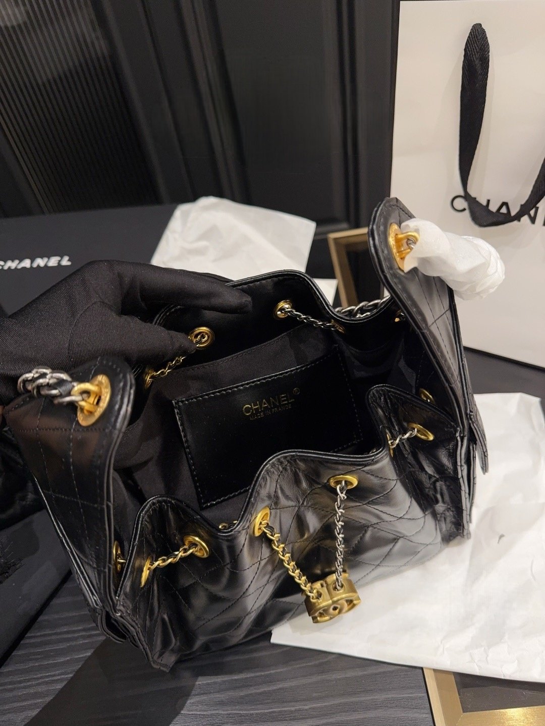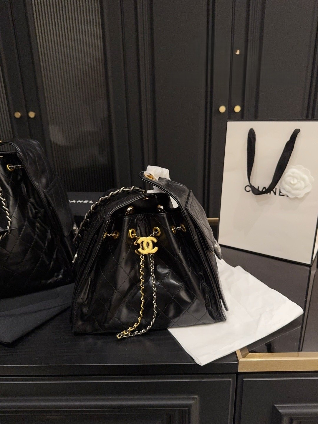 采用优质粒面小牛皮精制而成,兼具耐用性和奢华质感。金色金属配件,包括抽绳封口上的标志性CC标志,进一步提升了包袋的整体魅力。