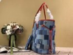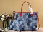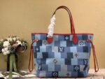 Louis Vuitton  LV Neverfull MM Bag Monogram Denim M44981 BLV480. This edition of the legendary Neverfull tote looks fresh and fashionable. dressed in a patchwork of denim-blue hues. The pattern combines Damier with Monogram motifs. expertly printed on the canvas to give the illusion of texture and volume. Handles and side laces made of brilliant red leather enhance the crafted look of this versatile signature bag.