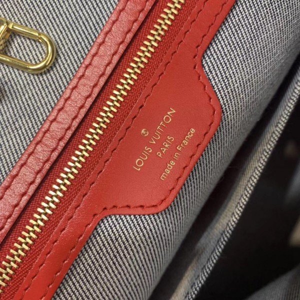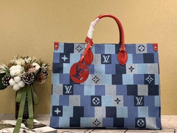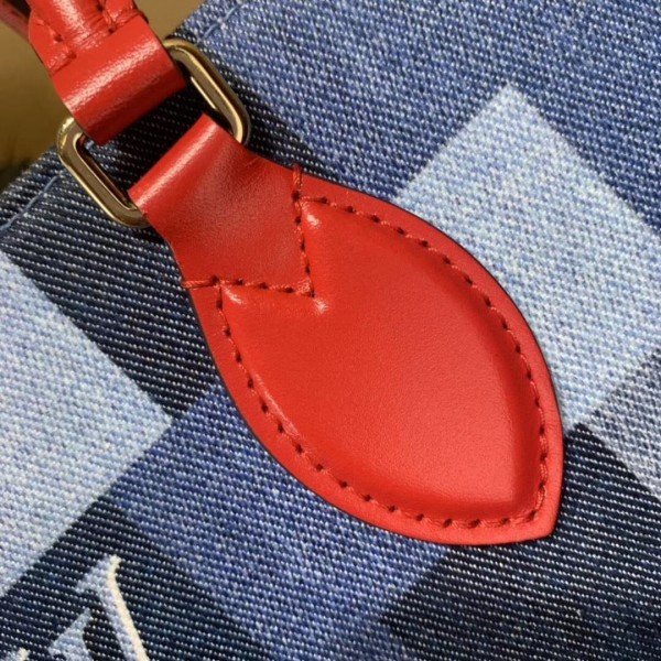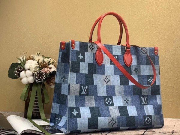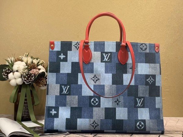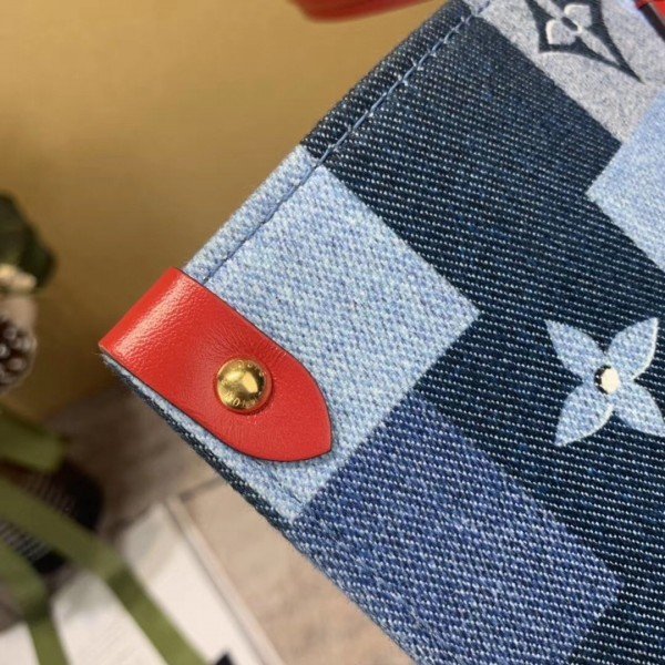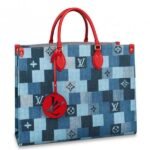 Knockoff Louis Vuitton fake LV Onthego GM Bag Monogram Denim M44992 BLV479. Damier and Monogram play stylishly together on this casual-chic Onthego GM tote bag. The patchwork pattern of raw and washed denim blue is printed on the canvas. creating an interesting illusion of texture. Subtle Monogram motifs add refinement. while the red leather trim brings a bold touch. A roomy. fashionable piece. perfect for everyday wear.